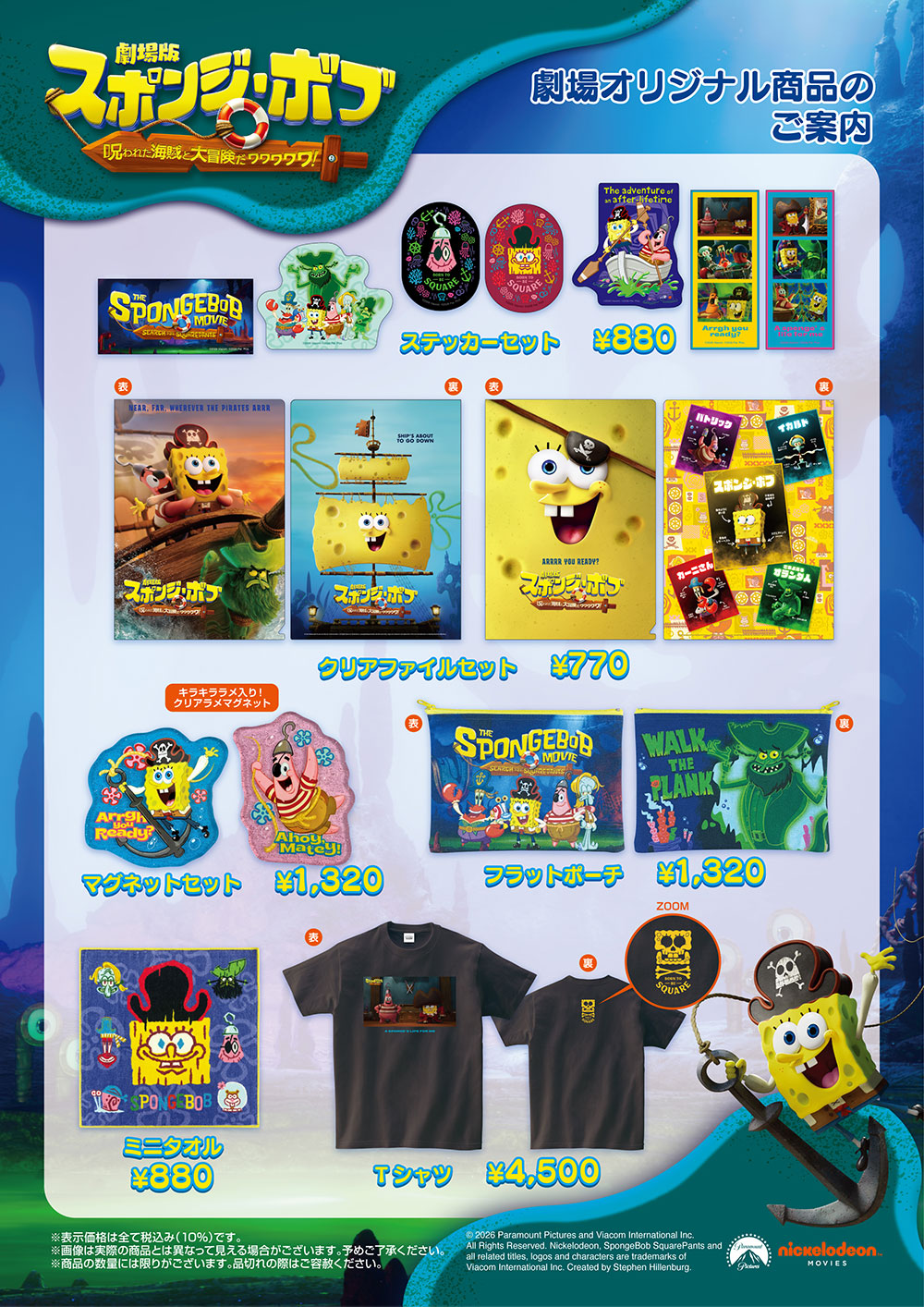 2026年4月1日(水)公開『劇場版スポンジ・ボブ 呪われた海賊と大冒険だワワワワワ!』の上映劇場で販売いたします。