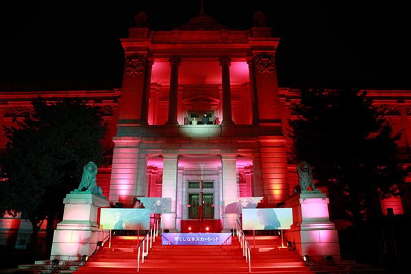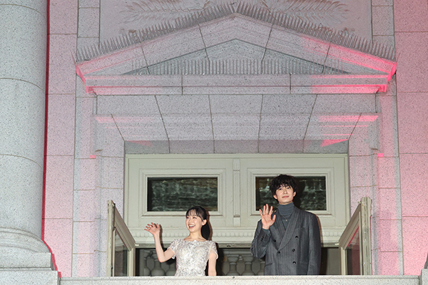 ■青くライトアップされていた建物が、スカーレットの髪の色であるピンク色に変わると、バルコニーに、芦田愛菜さんと岡田将生さんが登場。
