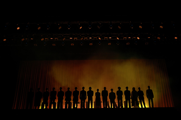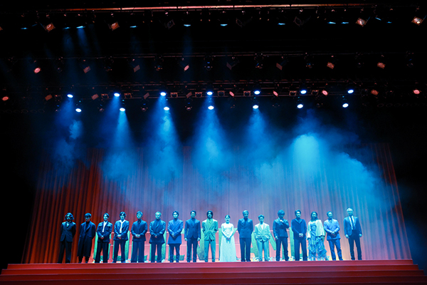 ■予告編映像が流れたのち、階段ステージにキャストのシルエットが投影される。主題歌である10-FEET「壊れて消えるまで」が流れる中、暗転幕があがりキャストたちが階段を下りてステージに一列に並びました。