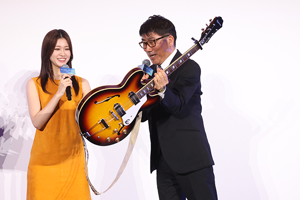 ■道枝さんが、マイクをサポートしながら生見さんがギターを肩から掛ける。