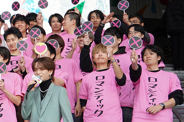 (街を見渡しながら)渋谷の皆さん、こんにちは。チーム「ロマンティック・キラー」です。今日はゲリライベントにも関わらず、たくさんの方にお集まりいただき本当にありがとうございます。(渋谷駅のエスカレーターに乗っている人に目を向けながら)エスカレーターの皆さんも、見えていますか? 本当にゲリラでやっています。渋谷の真ん中でやっているので、私もすごく新鮮な気持ちです。
